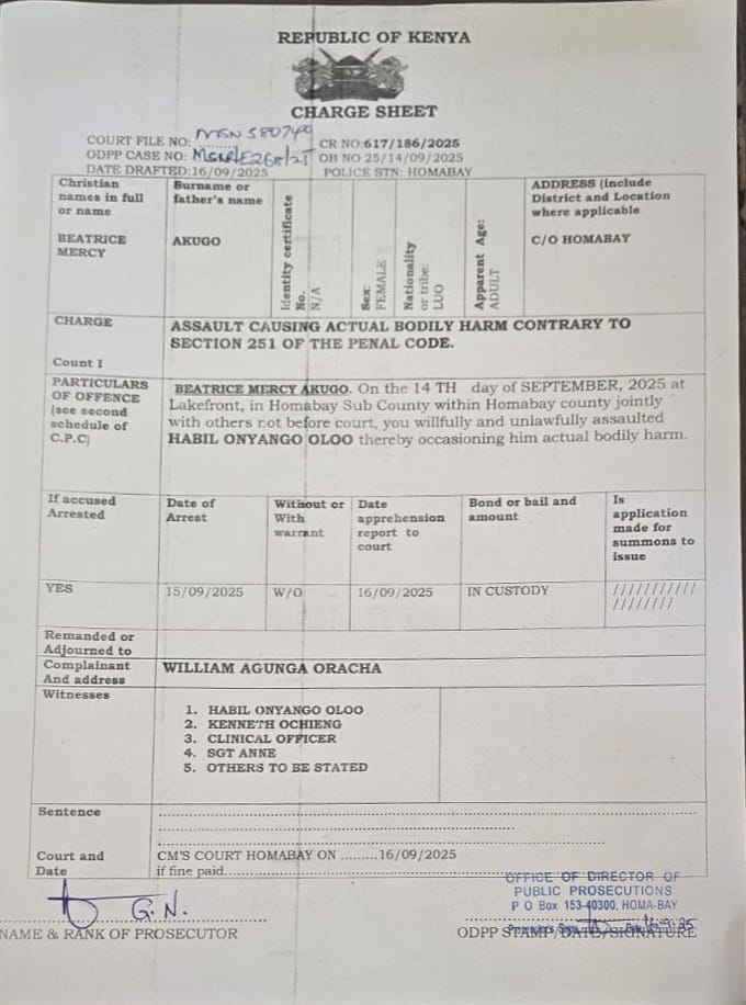 The suspect Beatrice mercy Akugo was today charged in court with assault causing actual bodily harm.